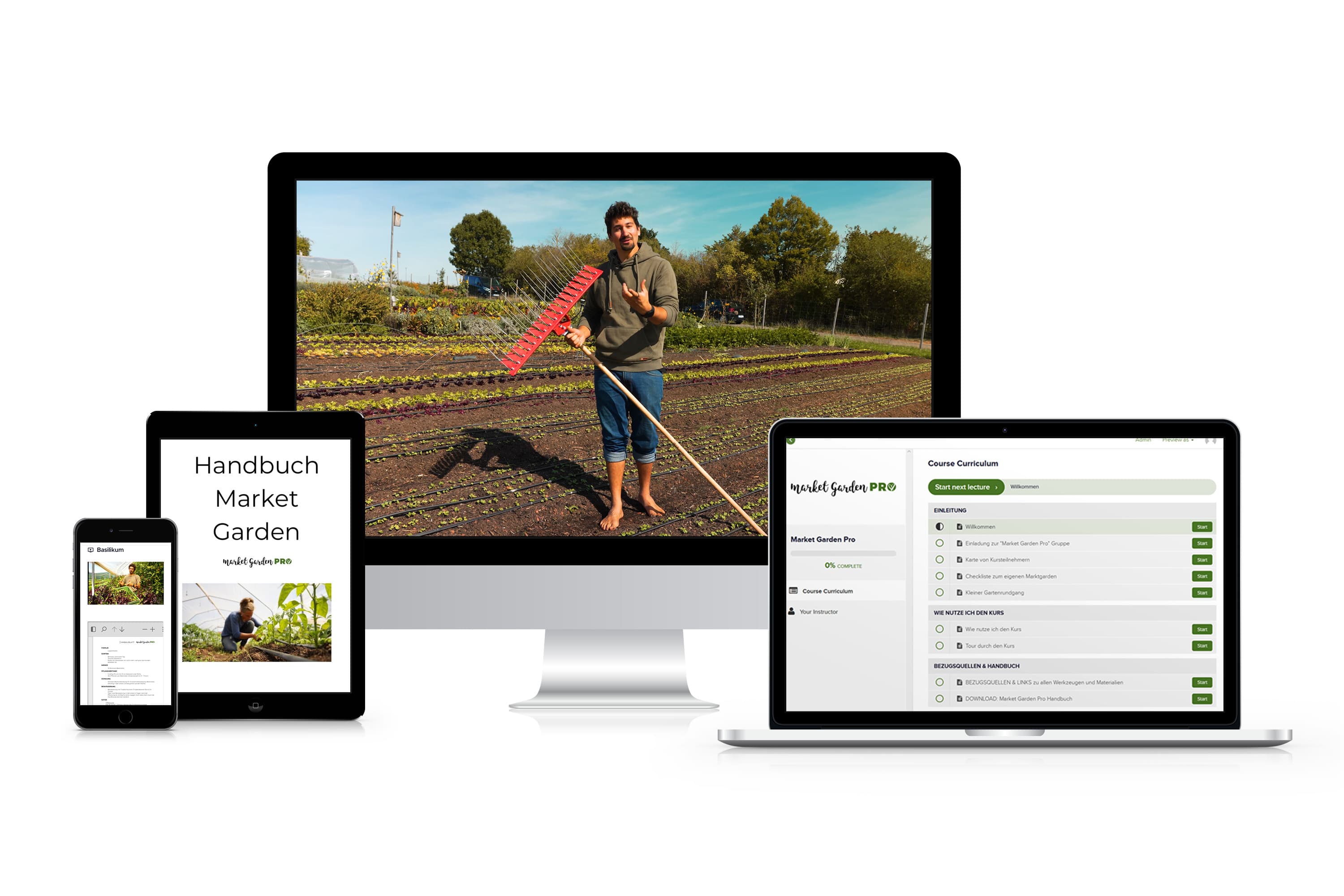 Market Garden Pro ist ein reiner Onlinekurs. Du kannst alle Inhalte über den Browser oder die App nutzen – am Computer, Tablet oder Smartphone. So hast du die Inhalte auch direkt im Garten griffbereit.